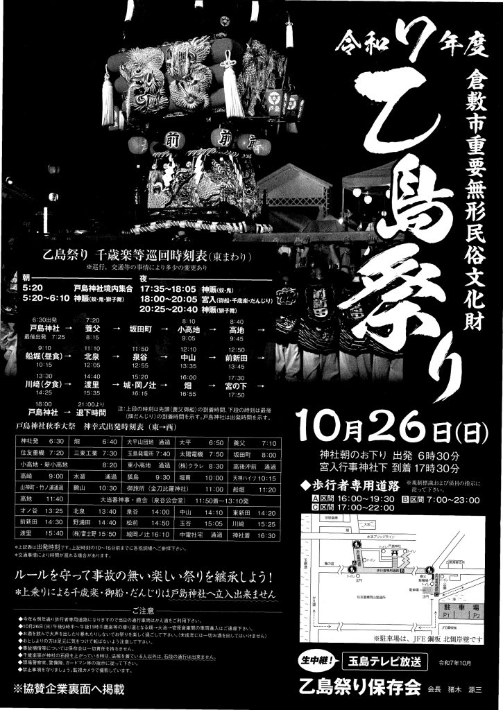 今年は、玉島テレビ放送による中継も予定されており、地域の皆さまにより広く乙島祭りの魅力をお届けします。さらに、放送内ではまるま梱包輸送の協賛CMが放映され、社名紹介も行われる予定です。
